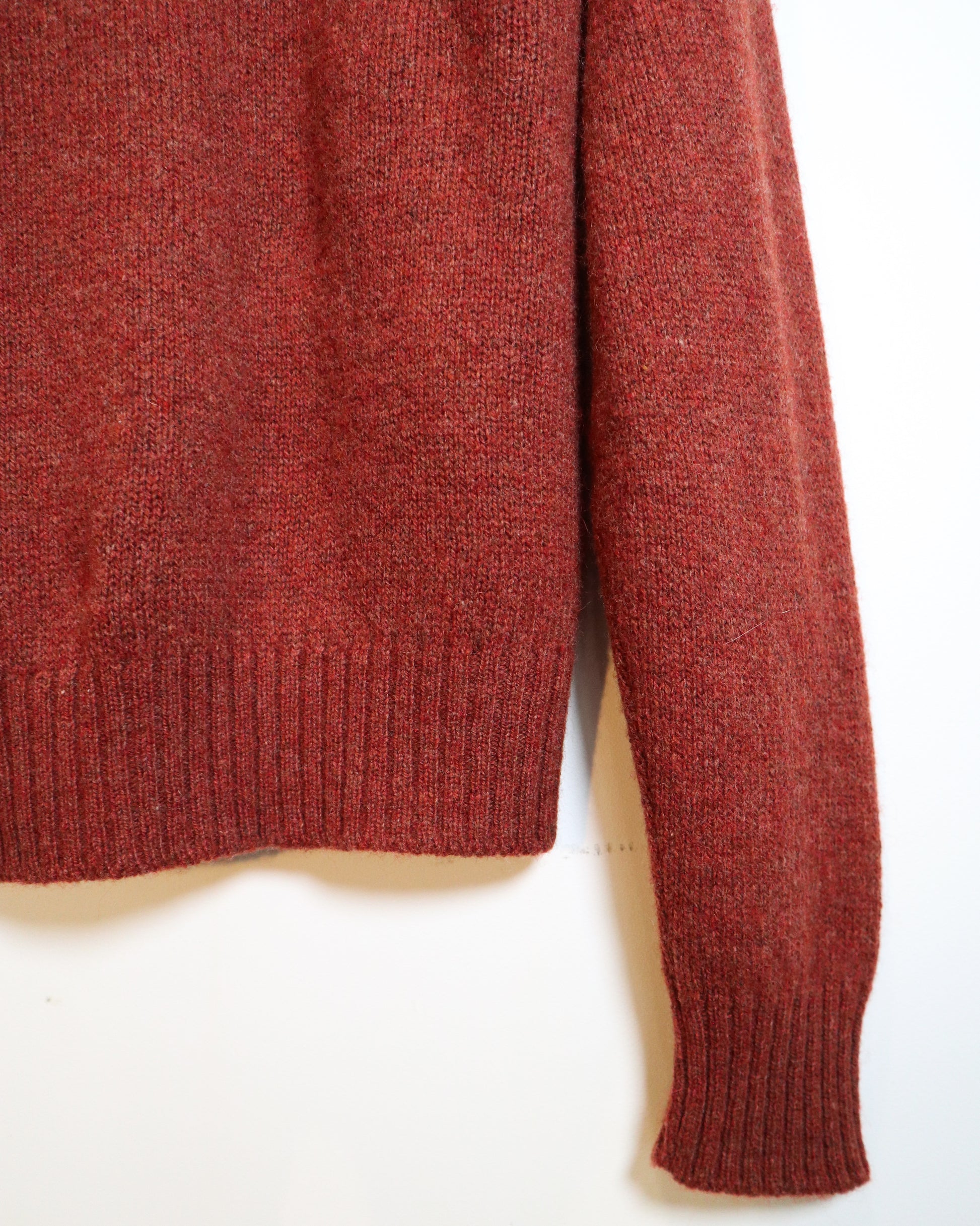 A beautifully marled vintage knit sweater in a rich rusted brown tone, featuring a clean, timeless silhouette with subtle texture throughout. Designed with raglan shoulders and no side seams, this piece has an effortless drape and a soft, broken-in hand that speaks to its age and quality. An understated essential that layers perfectly and wears easily on its own.