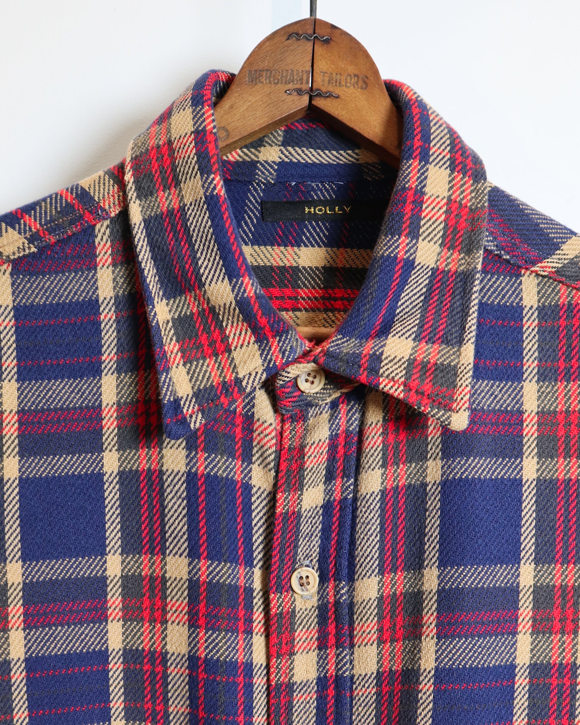A beautifully aged vintage flannel shirt cut from substantial yarn-dyed cotton in a rich navy, red and cream plaid. This piece features a relaxed, easy silhouette with perfectly placed chest pockets and classic button detailing throughout. The fabric has softened over decades of wear, creating a lived-in drape and warmth that feels effortless and timeless, the kind of shirt that only vintage can deliver.