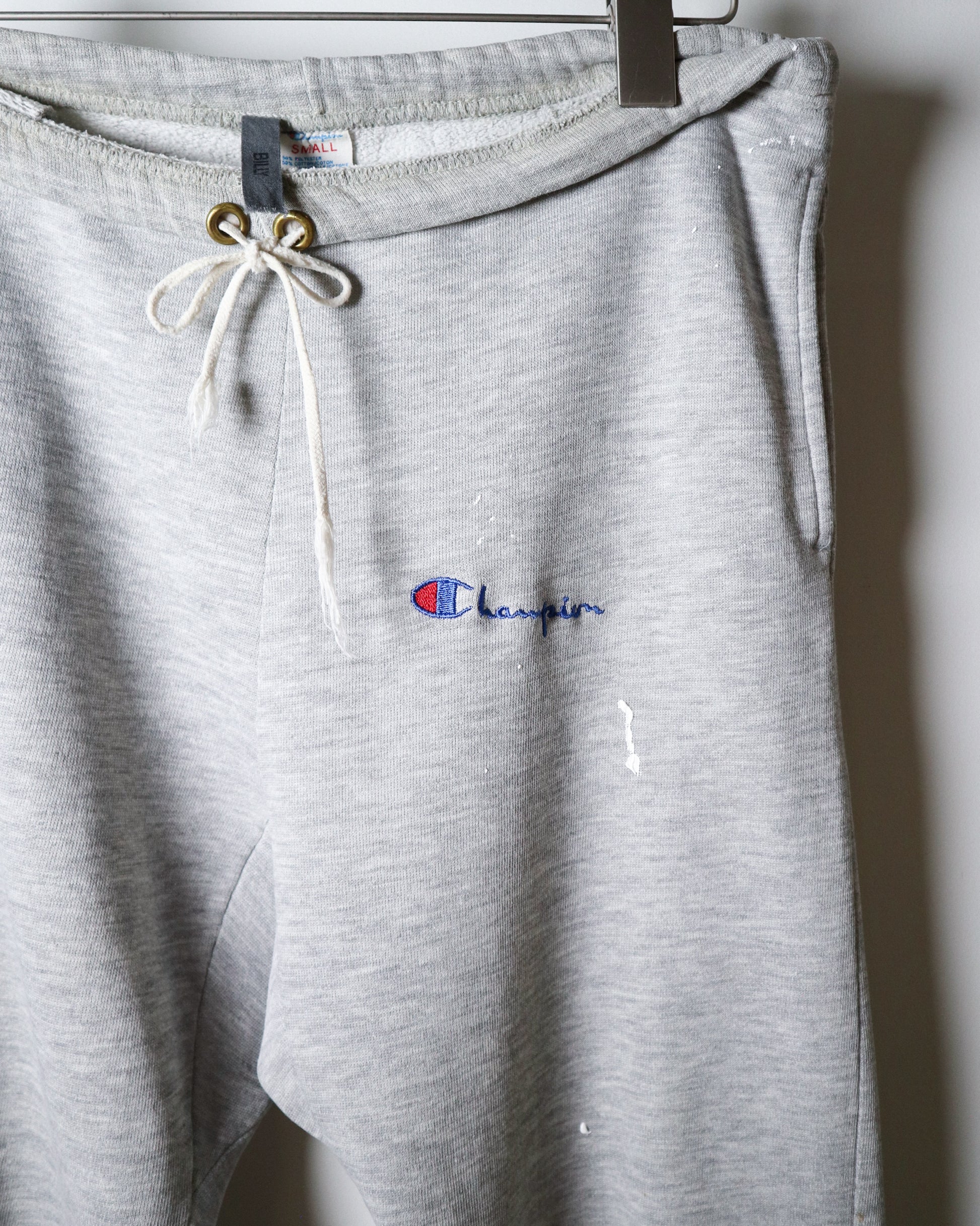 An iconic, classic pair of 1990s Champion sweatpants with an easy, athletic silhouette and authentic wear throughout. Finished with an embroidered Champion logo at the left thigh, interior drawcord waist, and functional side pockets, this pair reflects the era’s focus on comfort and durability. A gusseted inseam allows for ease of movement, while the fleece has softened beautifully over time with subtle white paint marks, giving the pants a lived-in feel that’s unmistakably vintage.
